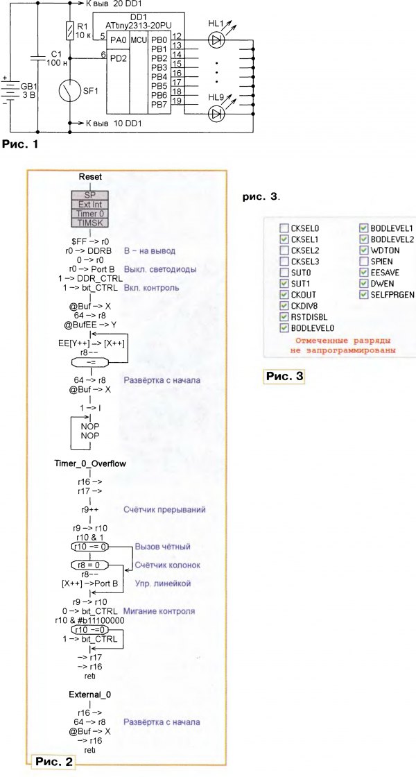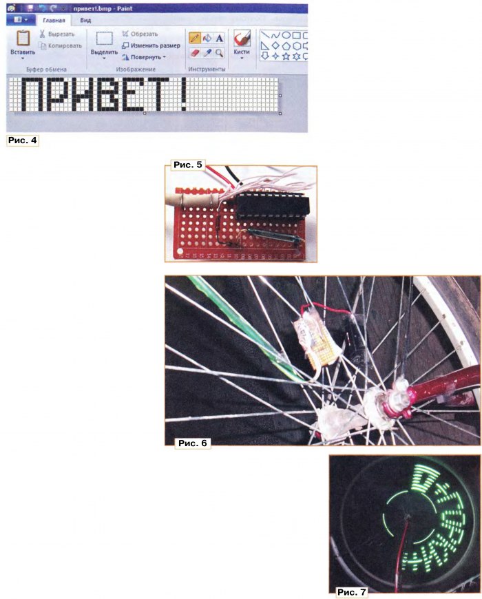 Тема: Украшаем колесо велосипедаУкрашаем колесо велосипеда А. ПАХОМОВ, г. Владимир Описано простое устройство динамической подсветки вращающегося колеса велосипеда. Оно позволяет получить на колесе статическое монохромное изображение любой записанной в память микроконтроллера картинки. Рисунок формируется линейкой светодиодов. Использован микроконтроллер ATtiny2313. Как-то гуляя в парке, я обратил вни-Ь мание на светящиеся в отражённом свете катафоты на вращающихся колёсах проезжавшего мимо велосипеда. Невольно пришла мысль, что если вместо отражателей использовать светящиеся и управляемые микроконтроллером светодиоды, можно получить на колесе практически любое изображение. Оказалось, мысль не нова — уже было опубликовано описание схожего устройства (Мельник В. Пишем в воз- духе светодиодами. — Радио, 2006, № 10, с. 59), а в интернет-магазинах можно найти и готовые устройства, формирующие световые узоры на вращающемся колесе. В этой статье рассматривается вариант устройства подсветки, создающий на колесе велосипеда одноцветное изображение из восьми строк по 64 точки в каждой. Для реализации развёртки использована линейка светодиодов, закреплённая на одной из спиц велосипедного колеса. При его вращении линейка смещается по окружности, синхронно с её перемещением переключаются светодиоды. В результате получаем круговую развёртку с числом концентрических окружностей ("строк"), равным числу светодиодов в линейке. Возможное число точек в "строке” равно времени одного оборота колеса, делённому на период смены состояния светодиодов. Сразу возникает вопрос, какой должна быть скорость движения вело-сипеда< для создания более-менее связной разборчивой картинки? В кинематографе, например, кадр обновляется 24 раза в секунду. Чтобы достичь такой частоты, велосипед с диаметром колеса около 0,7 м должен двигаться со скоростью 190 км/ч. Это почти равняется рекорду скорости велосипедиста 200 км/ч, достигнутому при движении по идеально ровной поверхности в "воздушном мешке". А на обычном велотреке практически невозможно достичь скорости 90 км/ч. Печально... Но практика показала, что при пониженной внешней освещённости и известной доле фантазии наблюдателя можно увидеть связную картинку и при значительно меньшей скорости "развёртки". Решение поставленной задачи довольно простое. В памяти микроконтроллера хранится образ формируемого изображения. Через заданные интервалы времени информация о содержимом очередной "колонки" растра подаётся на светодиоды. Начало "кадра" задаёт установленный на колесе геркон, проходя рядом с закреплённым на вилке колеса магнитом. По его сигналам развёртка изображения повторяется. Схема устройства подсветки показана на рис. 1. Микроконтроллер DD1 (ATtiny2313-20PU) через порт В управляет светодиодами HL1—HL8 линейки. Светодиод HL9, подключённый к выходу РАО, служит контрольным индикатором. При напряжении питания, не превышающем 3 В, ограничение тока светодиодов резисторами не требуется. На допустимом уровне его ограничивают внутренние защитные цепи выходов микроконтроллера. Геркон SF1 подключён к входу запросов внешних прерываний INTO (PD2) микроконтроллера. Сигналы с геркона запускают каждый цикл развёртки изображения. Питается устройство от двух гальванических элементов типоразмера ААА. Выключатель питания отсутствует, у