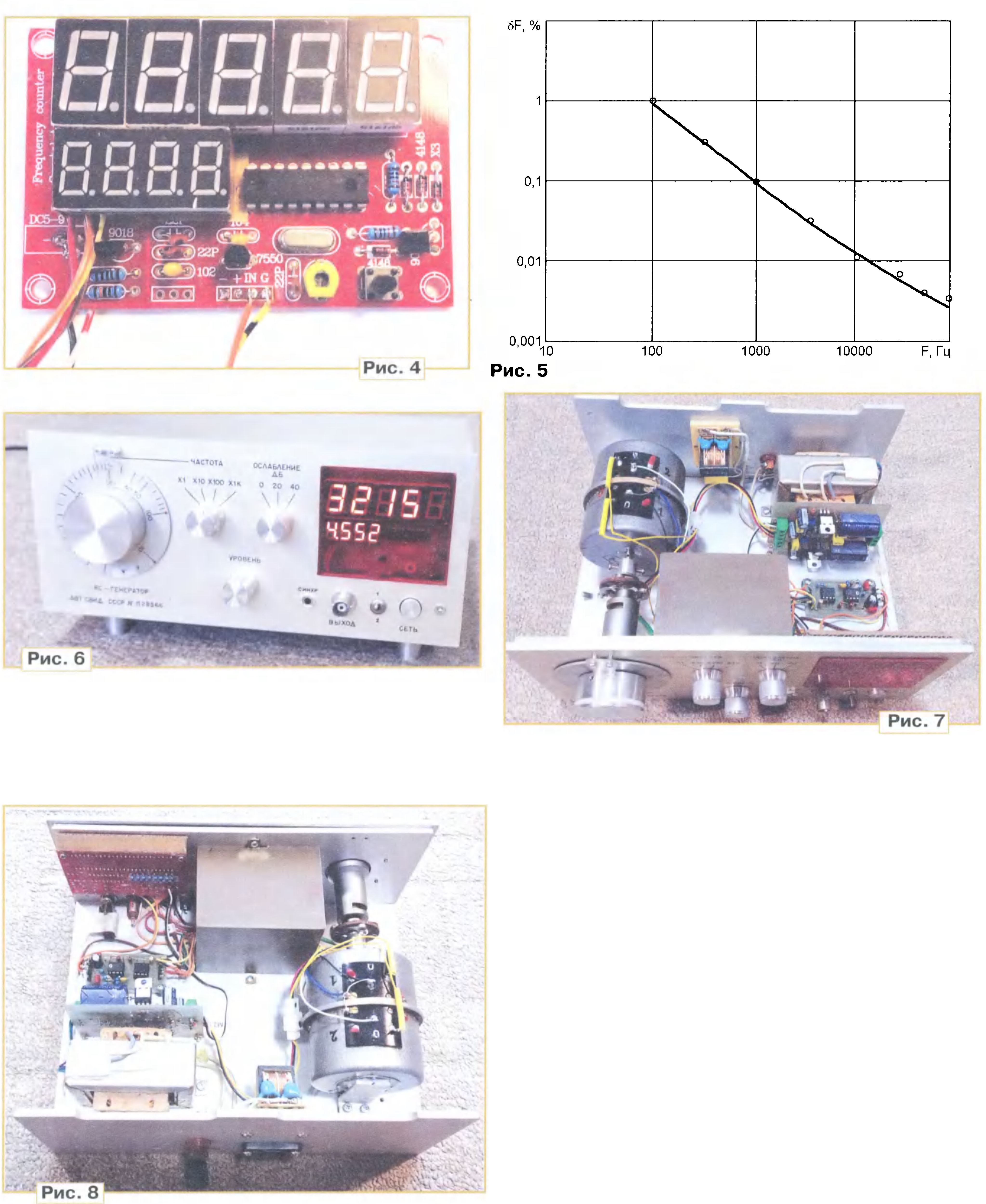 Ёмкости частотозадающих конденсаторов С1—С8 подбирают с погрешностью не более 1 %. Для получения указанных на схеме значений ёмкостей несколько подобранных конденсаторов соединяют параллельно. В генераторе применены плёночные лавсановые и полипропиленовые конденсаторы с малым ТКЕ и ESR К73-17, СВВ. Переключатель поддиапазонов SA1 — RS1010 на четыре положения, два направления. Частота синусоидального сигнала плавно перестраивается двухсекционным переменным резистором R1. Резисторы R2, R3 — ограничительные. Неравномерность амплитуды сигнала генератора по частоте существенно зависит от разбаланса секций сдвоенного резистора. Желательно, чтобы он не превышал 3 %. В приборе применён проволочный переменный резистор с линейной зависимостью ПЛ2-1, разбаланс секций которого соответствует указанному значению. Нестабильность амплитуды в первом, втором и третьем частотном диапазонах не более ±1,5 %, в четвёртом диапазоне — ±2,5 %. Возможен вариант перестройки частоты сдвоенным переменным конденсатором. Обычно для этого используют конденсаторы переменной ёмкости (КПЕ), имеющие Стах=500 пФ. Измерения показали, что разбаланс ёмкостей секций подобных конденсаторов с воздушным диэлектриком не превышает 1,5...2 %. Ёмкость таких конденсаторов можно подстраивать, подгибая крайние лепестки ротора. В этом случае для обеспечения минимальной частоты генерации около 10 Гц в мосте необходимо использовать резисторы сопротивлением 28 МОм. Столь высокоомные цепи весьма чувствительны к наводкам и помехам, что потребует тщательного экранирования переменного конденсатора и платы переключателя диапазонов. Корпус КПЕ изолируют от шасси. Для получения малых значений коэффициента гармоник на частотах более 3 кГц применён быстродействующий операционный усилитель LM4562NA (DA1) с частотой единичного усиления F1=55 МГц. ![]() Амплитуда выходного напряжения генератора стабилизируется цепью отрицательной обратной связи (ООО), в которую включён терморезистор (термистор) ТПМ-2/0.5А (RK1), сопротивление полупроводникового элемента которого уменьшается с ростом протекающего через него тока [2]. В показанном на схеме положении переключателя SA2 режим работы цепи автоматической регулировки определяется в основном термистором и резистором R6. Амплитуда выходного напряжения равна 5 В. В этом режиме прибор удобно применять для быстрого измерения АЧХ. В противоположном положении переключателя SA2 ток, протекающий через термистор, падает, что приводит к снижению коэффициента гармоник, но увеличивается нестабильность амплитуды по частоте. Этот режим применяют, когда АЧХ измерена, и определены частоты, на которых необходимо измерить коэффициент гармоник. На рис. 2 в логарифмическом масштабе показаны зависимости коэффициента гармоник выходного сигнала Кг от частоты F в первом (кривая 1) и втором (кривая 2) режимах работы. В первом режиме генератор обеспечивает более высокую стабильность выходного напряжения в диапазоне частот, во втором режиме — более низкий коэффициент гармоник. В измерениях использована программа Spectralab и 24-разряд-ная звуковая карта ASUS Xonar D2X. В первом режиме на частоте 1 кГц коэффициент гармоник генератора — около 0,002 %, во втором режиме — около 0,0008 %. На частотах ниже 1 кГц коэффициент гармоник увеличивается за счёт модуляции полупроводниково- го элемента термистора выхо