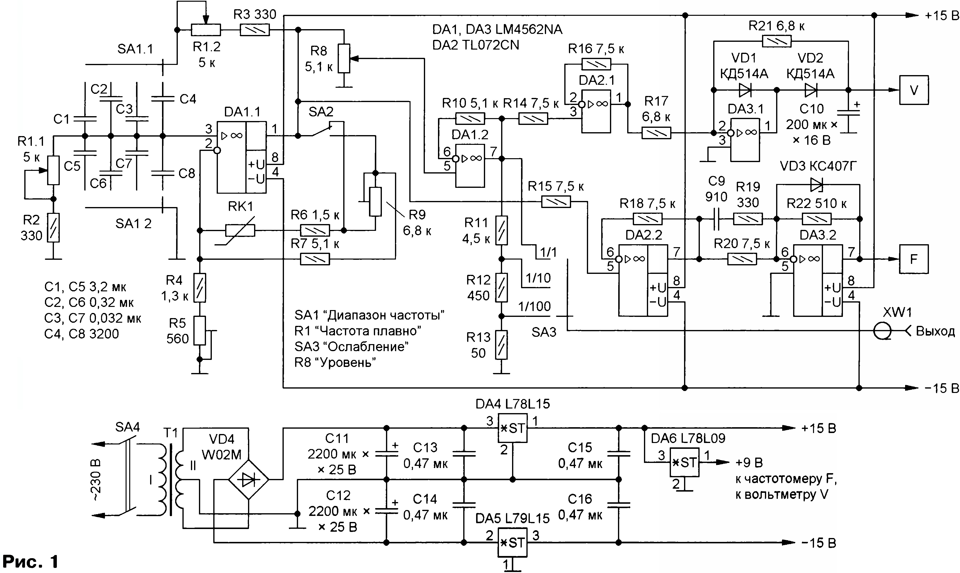 Тема: Генератор синусоидальных сигналов низких частотГенератор синусоидальных сигналов низких частот Н. ШИЯНОВ, г. Люберцы Московской обл. Генераторы низких частот (ГНЧ) — источник незатухающих синусоидальных колебаний в диапазоне частот от единиц герц до сотен килогерц, они широко используются при разработке и налаживании разнообразной радио-электронной аппаратуры. При разработке высококачественных низкочастотных усилителей необходимы генераторы с малыми гармоническими искажениями и расширенными функциональными возможностями. ![]() Ниже описан прибор, в котором генератор синусоидального сигнала с низким коэффициентом гармоник дополнен измерителями амплитудного значения напряжения и частоты выходного сигнала. RC-генератор (рис. 1) выполнен на основе моста Вина-Робинсона, включённого в цепь положительной обратной связи ОУ. Частота квазирезонанса такого моста при условии, что R1.1=R1.2 и С1=С5, на которой возбуждается усилитель, равна F=0,159/RC [ 1 ]. Добротность моста — 0=0,33. Для возникновения автогенерации коэффициент передачи усилителя должен быть >3, входное сопротивление ОУ — Rbx >> R1, а выходное сопротивление — Ввых << R1. Современные ОУ с полевым транзистором на входе вполне удовлетворяют этим условиям.