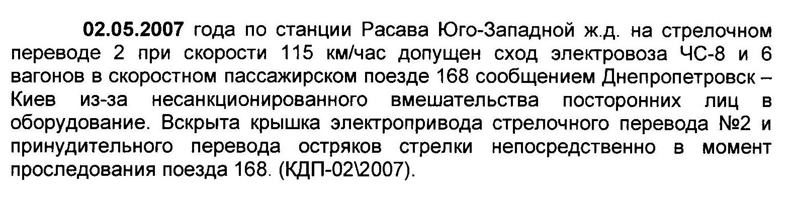 Пару лет назад на Украине был сход пассажирского поезда, не помню точно где, но умудрились перевод стрелки в маршруте отнести как несанкционированное вмешательство посторонних лиц, типа веревкой стрелку перевели !!! (Это высший пилотаж защиты чести и достоинства).