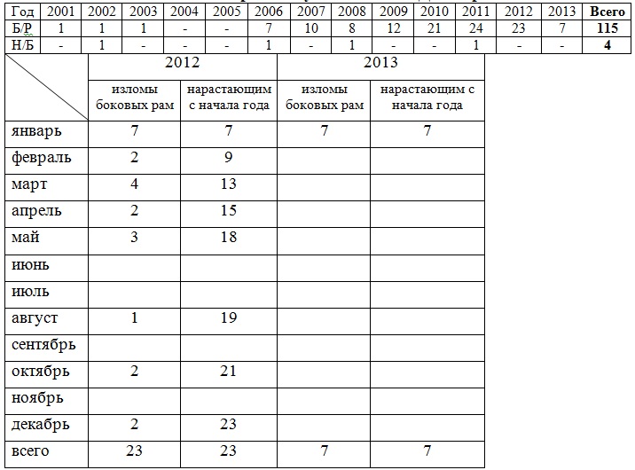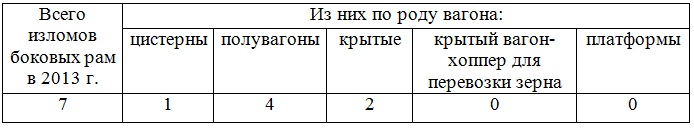 Тема: Справка по случаям излома литых деталей тележек на 21 января 2013 годаСправка по случаям излома литых деталей тележек на 21 января 2013 года С начала 2013 года на железных дорогах ОАО «РЖД» произошло 7 случаев изломов боковых рам тележек, которых привел к 2 крушениям на Забайкальской и Восточно-Сибирской ж.д. и 5 сходам подвижного состава на Западно-Сибирской, Забайкальской ж.д., Горьковской ж.д. и 2-ум случаям на Южно-Уральской ж.д. Изломавшиеся боковые рамы были изготовлены: ОАО «Алтайвагон» - 1 шт. 2011 г.; ЧАО Азовэлектросталь – 1 шт. 2007г; - 1шт. 2011г.; ООО Промтрактор – Промлит – 1шт. 2008г.; ОАО «НПК Уралвагонзавод» - 1шт. 2007г.; ПАО «Кременчугский сталелитейный завод» - 2шт. (1983г, 2011г.) Хроника 7 случаев 1. (Сход) 3 января Западно-Сибирская ж.д. на станции Исилькуль в поезде № 2603 у груженого вагона № 55936439 (полувагон) выявлен излом боковой рамы № 7262 в зоне R-55. Боковая рама изготовлена в 2011 г ООО «Алтайвагон» (клеймо 22). От ПТО последнего ТО станции Московка Западно-Сибирской ж.д. проследовал 145,7 км. 2. (Сход) 8 января Южно-Уральская ж.д. на перегоне Макушино-Конавалово Курганского региона в поезде № 2691 у груженого вагона № 28036283 (крытый) выявлен излом боковой рамы № 36663 в зоне R-55. Боковая рама изготовлена в 2007 г ЧАО АзовЭлектроСталь. От ПТО последнего ТО станции Московка Западно-Сибирской ж.д. проследовал 416 км. 3. (Сход) 9 января Южно-Уральская ж.д. на перегоне Горбуново-Мамлютка в поезде № 2610 у вагона № 54741863(цистерна) выявлен излом боковой рамы № 115951 в зоне R-55. Боковая рама изготовлена в 2011г ЧАО «АзовЭлектроСталь». От ПТО последнего ТО станции Екатеринбург-Сортировочный проследовал 590 км. 4. (Сход) 10 января Забайкальская ж.д. на перегоне Антипиха – Атамановка в поезде № 2088 у вагона № 52064011 (крытый), выявлен излом боковой рамы №39408 в зоне R-55. Боковая рама изготовлена в 2008 г ООО «Промтрактор-Промлит». От ПТО последнего ТО станции Улан-Удэ проследовал 563 км. 5. (Крушение) 10 января Забайкальская ж.д. на перегоне Красная Падь – Дактуй в грузовом поезде № 2036 у вагона № 62818935 (полувагон) выявлен излом боковой рамы в зоне R-55. Боковая рама № 4612 изготовлена в 2007 году ОАО «НПК Уралвагонзавод». От ПТО последнего ТО станции Могоча проследовал 622 км. 6. (Крушение) 12 января Восточно-Сибирская ж.д. на перегоне Слюдянка – Утулик двухпутного электрифицированного участка Иркутск – Улан-Удэ в поезде № 2012 у вагона № 62182720 (полувагон) произошел излом боковой рамы в зоне R-55. Боковая рама № 23092 изготовлена в 1983 г. усл. клеймо 14 ПАО «Кременчугский завод стального литья». От ПТО последнего ТО станции Тайшет Восточно-Сибирской ж. проследовал 820км. 7. (Сход) 19 января Горьковская ж.д. на перегоне Великая-Мосинский однопутного неэлектрифицированного участка Сусоловка-Лянгасово в поезде № 2379 у вагона № 53199733 (полувагон) произошел излом боковой рамы в зоне R-55. Боковая рама № 43676 изготовлена в 2011 г. усл. клеймо 14 ПАО «Кременчугский завод стального литья». От последнего ПТО станции Сольвычегодск Северной ж.д., проследовал 309 км. ![]() В 2013 году – боковых рам - 7 шт: • Изготовления 2011 г. – 1 шт. ОАО «Алтайвагон» • 2011 г. – 1 шт. ЧАО «АзовЭлектроСталь» • 2011 г. – 1 шт. ПАО «Кременчугский сталелитейный завод» • 2008 г. – 1 шт. ООО Промтрактор Промлит • 2007 г. – 1 шт. ЧАО «АзовЭлектроСталь» • 2007 г. – 1 шт. ОАО «НПК Уралвагонзавод» • 1983 г. - ПАО «Кременчугский сталелитейный завод» В 2012 году – боковых рам – 23 шт: • Изготовления 2011 г. – 1 ш