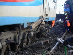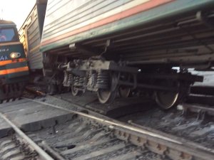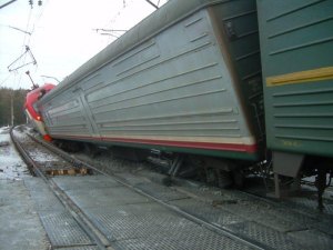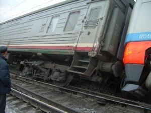 05.11.2014 в 05-12 на станции Сабик допущено боковое столкновение грузового поезда № 2021 (6251 тонна, 288 осей, 74 вагона) с электровозом ВЛ11М № 248АБ/249А приписки эксплуатационного локомотивного депо ТЧЭ-1 Смычка под управлением локомотивной бригады в составе: машиниста электровоза Шумихина В.Р. и помощника машиниста Лонского Е.А. приписки эксплуатационного локомотивного депо ТЧЭ-5 Свердловск-Сорт. и пассажирского поезда № 99 сообщением Владивосток – Москва (942 тонны, 68 осей, 17 вагонов, населенность 280 человек) с локомотивом ЭП2К № 025 приписки ТЧЭ Барабинск под управлением локомотивной бригады в составе: машиниста электровоза Иванова С.Г. и помощника машиниста Балуева А.Л. приписки эксплуатационного локомотивного депо ТЧЭ-17 Пермь-Сорт. В результате столкновения: в сходе локомотив ЭП2К № 025 всеми колесными парами (накренен в сторону четного пути, угол наклона приблизительно 45 градусов), первый по ходу движения багажный вагон № 02850048 всеми колесными парами (накренен в сторону четного пути, угол наклона приблизительно 30 градусов), второй по ходу движения багажный вагон № 09784661 первой по ходу движения тележкой всеми колесными парами. Обстоятельства случая. 05.11.2014 в 5-05 на 1-ом пути станции Сабик при оказании помощи грузовому поезду № 2021 (причина оказания помощи: отключение БВ при переходе с СП на П) вспомогательным локомотивом 15ВЛ11-364/352Б приписки эксплуатационного локомотивного депо ТЧЭ-17 Пермь-Сортировочная под управление машиниста Сапкулова И.С. и машиниста Шмакова С.К. приписки эксплуатационного локомотивного депо ТЧЭ-5 Свердловск-Сортировочный, прибывшим со станции Шаля в 4-12 допущено боковое столкновение с пассажирским поездом № 99, следовавшим по 2-му пути на стрелочном переводе № 2-4. Для ликвидации схода приказом № 57 в 05-23 ДГПРУ Гнызин поднят ВП станции Кузино, приказом № 52 в 05-43 ДГПРУ Гнызин поднят ВП станции Екатеринбург-Сорт. В 06-03 №8002 отправление ВП со станции Кунгур, прибытие на станцию Сабик в 10-20. В 06-36 №8001 отправление ВП со станции Кузино, прибытие на станцию Сабик в 07-04. В 06-44 №8003 отправление ВП со станции Екатеринбург-Сорт., прибытие на станцию Сабик в 10-01. Хронология проведения работ: В 08-04 накаточным оборудованием поднят 1-й вагон №84 661 В 10-00 накаточным оборудованием поднят поднят 2-й вагон №050 048 В 12-32 совместно двумя кранами ЕДК-1000 и КЖ-1572 поднят локомотив ЭП2К-025 (ТЧЭ-3 Барабинск) В 13-20 кран ЕДК-100 приведен в транспортное положение, в 13-35 дана техническая готовность, в 13-40 отправление ВП со станции Сабик. В 13-15 кран КЖ-1572 приведен в транспортное положение, в 13-25 дана техническая готовность. ХАРАКТЕРИСТИКА УЧАСТКА нечетный путь 1707 км Путь бесстыковой, рельсы Р-65, балласт щебень, эпюра шпал 2000 шпал на километр, класс 1/А/3, грузонапряженность 85,9 млн. т брутто/км в год, пропущенный тоннаж на 01.01.2014 371 млн. т брутто, реконструкция проведена в 2009 году, установленная скорость движения пассажирских поездов 70 км/час, грузовых поездов 70 км/час. План пути: левая кривая 1707 км 245 м – 1707 км 584 м протяжением 339 м радиусом 620 м, средняя величина бокового износа – 12 мм, возвышение 70 мм, правая кривая 1707 км 675 м – 1707 км 867 м протяжение кривой 192 м радиусом 665 м, возвышение 60 мм, боковой износ 13 мм. Профиль: 1707 400 м – 1707 км 600 м – спуск 7‰, 1707 км 601- 1707 км 800 м – спуск 5,6‰. Стрелочный перевод №2 уложен 12.06.2009 г., проект 2768, рельсы Р65, марка крестовины 1/11, пропущенный тоннаж на 01.01.2014 г. 370,8 мл
