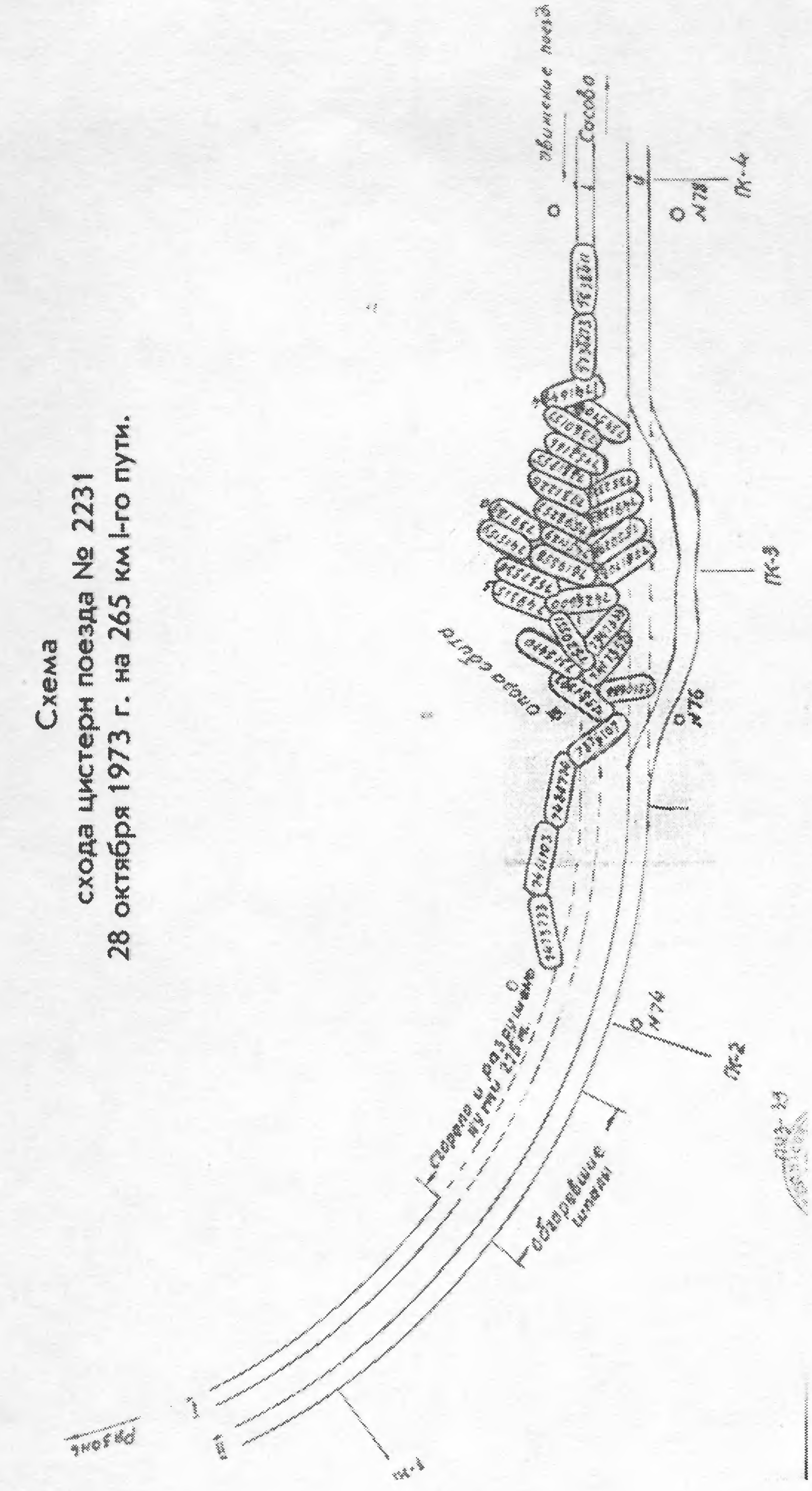 Тема: Крушение грузового поезда на перегоне Артем Приморский III— Шкотово ДвЖД 25 августа 1974 г.Крушение грузового поезда на перегоне Артем Приморский III— Шкотово ДвЖД 25 августа 1974 г. 25 августа 1974 г. в 12 часов 10 минут на перегоне Артем Приморский III— Шкотово Дальневосточной железной дороги на скорости 70 км/ч потерпел крушение грузовой поезд № 2902 (электровоз ВЛ60 -1407, машинист Сидоренко А.И., помощник машиниста Михеев Л.В.; вес 2623 т) из-за выхода за пределы габарита поворотной части экскаватора по причине незакрепления поворотной рамы стопорном устройством. Экскаватор марки Э—10011 Д весом 36 т был погружен 8 августа на станции Кострома мастером погрузки завода Щербаковым Н.Я. ![]() Отправитель — Костромской экскаваторный завод «Рабочий-металлист». На 30 километре пикет 3 произошел разворот поворотной части экскаватора. В результате была повреждена ферма однопролетного моста, затем, на 31 километре пикет 3 вследствие удара и заклинивания экскаватора первой фермой трехпролетного моста, разрушены две фермы моста, что вызвало нагромождение подвижного состава из 18 четырехосных вагонов. Все они подлежали исключению из инвентаря. Для восстановления разрушенного моста и пути было привлечено 608 человек, в том числе 130 военнослужащих. Работы шли почти 8 часов. Было задержано движение 30 пассажирских и пригородных поездов на 2040 часов, 78 грузовых поездов - на 5304 часа. Убытки составили 223,9 тысяч рублей |