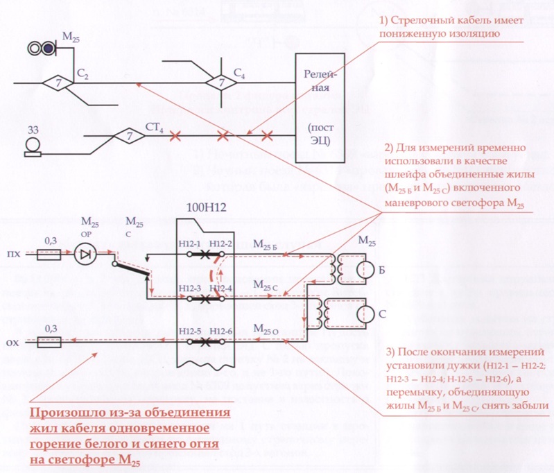 8 мая 1988 год СТОЛКНОВЕНИЕ МАНЕВРОВОГО ЛОКОМОТИВА С ПРИБЫВАЮЩИМ ГРУЗОВЫМ ПОЕЗДОМ ИЗ-ЗА ГОРЕНИЯ НА СИГНАЛЕ М25 ЛУННО-БЕЛОГО И СИНЕГО ОГНЯ 08.05.1988 г. на ст. Барабинск Западно-Сибирской ж. д. произошло столкновение маневрового локомотива на стрелке № 35 с прибывающим грузовым поездом с последующим сходом. Накануне ШНС производил измерение по отысканию места пониженного сопротивления изоляции стрелочного кабеля с использованием в качестве шлейфа жил кабеля светофора, который был включен дежурным ШНЦ с записью в журнале ДУ-46. По окончании работ ШНЦ не проверил на соответствие сигнальные показаний светофора, правильность перекрытия с разрешающего показания на запрещающее, включил светофор, сделав фиктивную запись о проверках. В результате из-за наличия перемычки, оставленной на клеммах статива, при объединении жил кабеля на светофоре горели синий и лунно-белый огонь. ТЧМ воспринял разрешающий огонь и проехал светофор. ![]() |