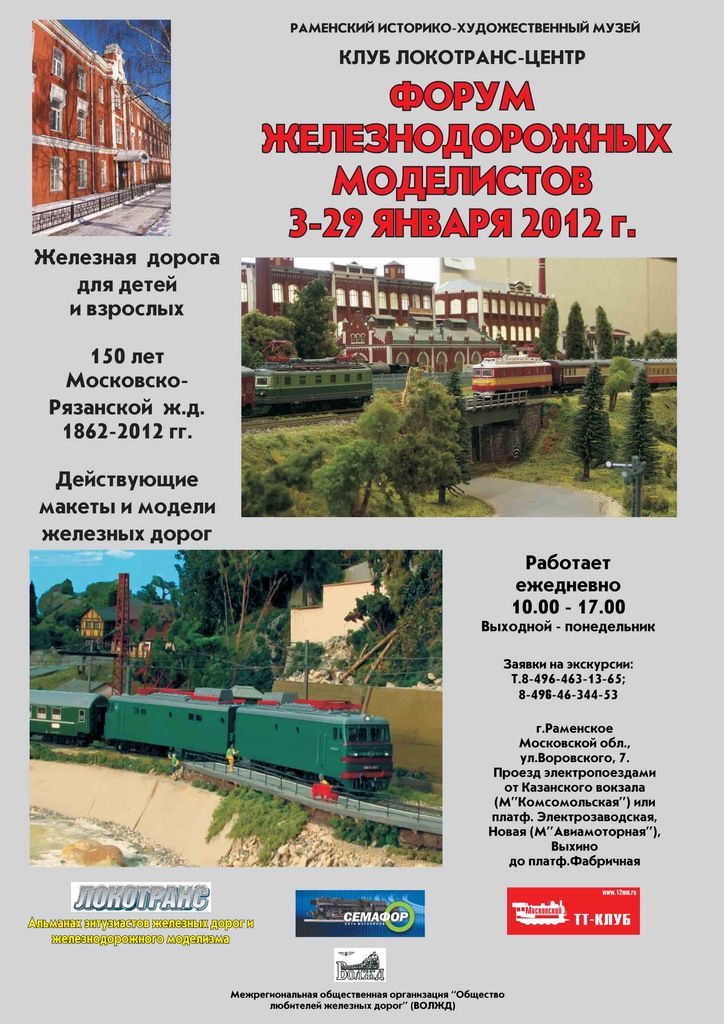Тема: В январе состоится форум железнодорожных моделистов РоссииВ январе состоится форум железнодорожных моделистов России 2012, посвященный 150-летию Московско-Рязанской железной дороги 1862-2012 гг. ОСНОВНЫЕ ТЕМЫ И ПРОГРАММА РАБОТЫ: Выставка ”История российских железных дорог в моделях» Тема в ж.д. моделизме - от "Рязанки" до "Спутника". Мастер-классы по изготовлению макетов и моделей Встречи с авторами Организаторы: клуб «Локотранс-Центр» и Московский ТТ-клуб ж.д. моделистов при содействии Раменского историко-художественного музея и ВОЛЖД 3 января 2012 г. ОТКРЫТИЕ ФОРУМА в 12 часов 4 января. Демонстрация макетов железной дороги Кинофорум. Авторское кино. Фильм Л.Н.Рагозина «Живые паровозы». Начало 13.00. 5. Января. Совместное торжественное заседание Клуба ЛТ-Центр, Московского ТТ-Клуба и Московского клуба им. ЦДКЖ-ВОЛЖД в связи со 150-летием Кинофорум . Авторское кино. 13.00 Фильм Виктора Никишина (посещение Праги и Берлина с LOXX) 6 января «День издательского дома « Железнодорожное Дело» Начало 12-00. Презентации новых изданий; Доклад главного редактора; Встречи авторов и читателей; 7 января Выставка работает с 11-00 до 15-00 Демонстрация макетов железной дороги 8 января Демонстрация макетов железной дороги Кинофорум . Авторское кино. 13.00 Фильм «Поезда, выигравшие войну» 9 января. Демонстрация макетов железной дороги Кинофорум . Авторское кино. 13.00 Фильм жд макетах в Германии Просмотр документальных фильмов Далее Форум работает по плану рабочих дней музея. 21 января. «150 лет первого поезда на линии Москва – Раменское - Коломна» Научно-практическая конференция. Начало 12.00 Кинозал 22 января Демонстрация макетов железной дороги Кинозал. Просмотр документальных фильмов 28 января. Предпоследний день работы Форума. 29 января. Закрытие Форума – 15.00 ФОТОВЫСТАВКИ «Привет с дороги». Коллекция ”История российских железных дорог в открытках». Фотовыставка фотографа Валерия Лобачевского, член СФР, Москва П.С. - В программе кинофорума возможны изменения и дополнения. - по субботам и воскресеньям вы можете приобрести сувениры и авторские работы Место проведения: г. Раменское, ул.Воровского 7 (пл.»Фабричная») Время работы: 10.00 – 17.00 с 3 января по 29 января, выходные дни - понедельник. График работы в праздничные дни новогодних каникул уточняйте по телефону Т. 8 496-46-327-94 Проезд из Москвы на электропоездах Голутвинского направления от Казанского вокзала или М «Выхино» до пл.Фабричная или на скоростном поезде «Спутник» до пл.Раменское. ![]() |