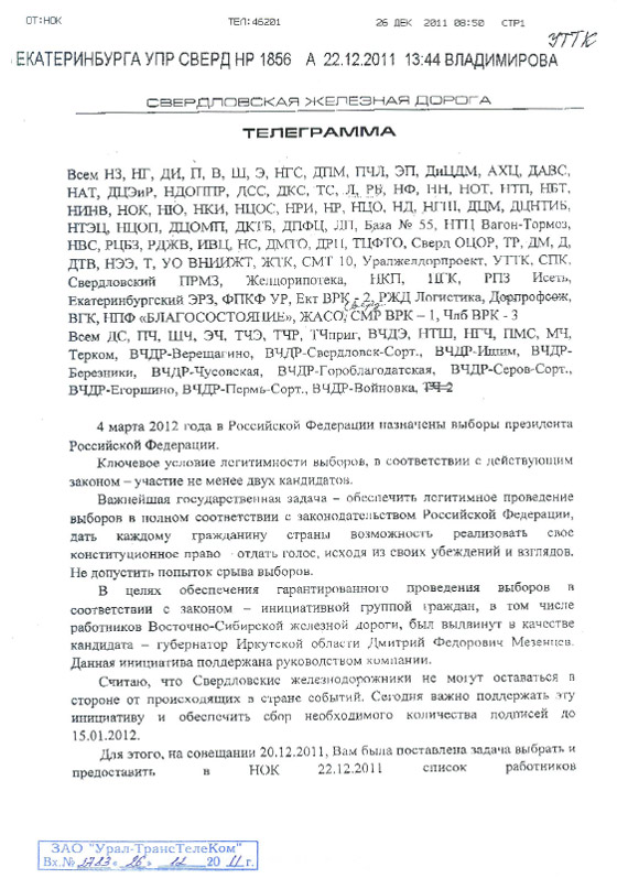 Тема: РЖД открестились от сбора подписей за МезенцеваРЖД открестились от сбора подписей за Мезенцева ОАО "РЖД" дезавуировало призыв к сбору подписей за выдвижение губернатора Иркутской области Дмитрия Мезенцева в президенты России, сообщает РИА Новости со ссылкой на пресс-службу РЖД. По словам собеседника агентства, РЖД отменило действие телеграммы, содержавшей этот призыв. ![]() ![]() Телеграмма с призывом к сбору подписей за Мезенцева была разослана ряду предприятий заместителем начальника Свердловской железной дороги Валерием Фоминым в конце декабря 2011 года. Копия этой телеграммы была опубликована утром 11 января в блоге активиста общественного движения "Демократический выбор" Игоря Драндина на сайте радиостанции "Эхо Москвы". Драндин обратил внимание на то, что в соответствии с законом о выборах президента РФ органы управления организаций не могут принимать участие в сборе подписей кандидатов, поэтому подобный призыв может расцениваться как нарушение закона. Комментарий официального представителя РЖД появился к вечеру 11 января. В пресс-службе компании заявили: "Данная телеграмма - инициатива конкретного должностного лица, а не позиция руководства дороги. Начальнику СвЖД Алексею Миронову поручено разобраться в этом вопросе". Дмитрий Мезенцев, выпускник Ленинградского института инженеров железнодорожного транспорта, был выдвинут в президенты России инициативной группой работников Восточно-Сибирской железной дороги. Так как он не является кандидатом от какой-либо парламентской партии, для выдвижения к середине января 2012 года ему необходимо собрать 2 миллиона подписей в свою поддержку. Телеграмма Фомина - не первый эпизод в предвыборной кампании Мезенцева, привлекший внимание движения "Демократический выбор". Несколько дней назад Игорь Драндин обвинил иркутского губернатора в подделке подписей и опубликовал в своем ЖЖ видео, якобы свидетельствующее об этом. Мезенцев, однако, впоследствии заявил, что никаких нарушений на этом видео нет. |