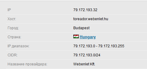 Щас посмотрим... IP 79.172.193.32 Хост: toreador.webenlet.hu Город: Budapest Страна: Hungary IP диапазон: 79.172.193.0 - 79.172.193.255 CIDR: 79.172.193.0/24 Название провайдера: Webenlet Kft.