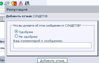 5 баллов за формулировку! Знающие - подскажите, какие манипуляции нужно сделать, чтобы повысить "репутацию" коллеге? Последний раз редактировалось Николай Николаевич; 28.07.2011 в 08:22. |