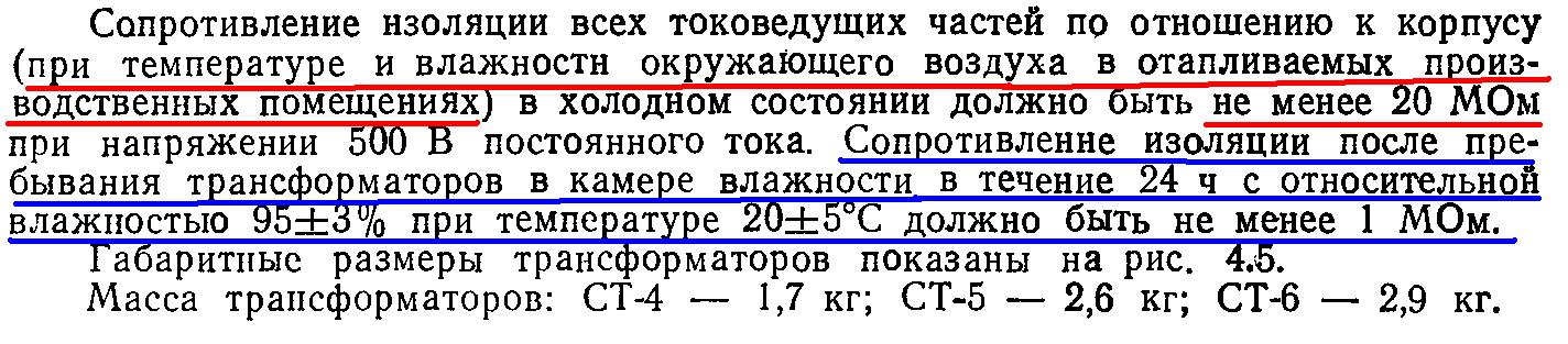Исходя из справочника, получается, что для СТ-4 при высокой относительной влажности воздуха, сопротивление изоляции может быть менее 20МОм, но не менее 1МОм? В РЦ нормали РЦ50-17А СТ-4 стоят, как релейные трансформаторы. Вчера снял один СТ-4 с изоляцией первички относительно корпуса - 1,5МОм, а между первичкой и вторичкой 12МОм. На улице сыро, мороз... может ли быть такая изоляция трансформатора нормой? Трансформатору 28 лет. Ток холостого хода 18мА - максимальный, но в норме. Положил вчера транс сушиться на батарею, сегодня утром показал 30МОм, а к вечеру 50МОм изоляцию первички по отношению к корпусу и более 200МОм между обмотками. В сухую погоду сопротивление изоляции транса с кабелем было более 200МОм.