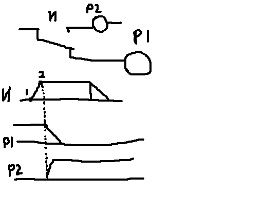 Реле И срабатывает. Размыкается общий и тыловой контакт. Фронтовой исче не замкнут. Реле Р1 лишается питания и начинает отпускать якорь (точка 1). Но как нам говорили, на диаграмме этот момент наступает в точке 2 (типо что-бы не было все налеплено на одной линии).