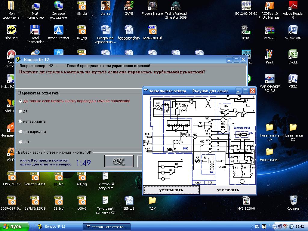 Вопрос № 10 не корректный. Например к.з. изостыков с соседней РЦ не всегда приведет к ложной занятости, т.к. есть зависимость от типа рельсовой цепи и взаимного расположения концов смежных РЦ у этого стыка. Я бы убрал вопрос по рельсовым цепям в тест по рельсовым цепям. Вопрос № 11. На мой взгляд правильный ответ: "Нет верного ответа". В цепи включения реле ПК контролируется также положение поляризованного якоря реле ППС и нейтрального якоря самого реле ОК. Т.е. наличие/отсутсвие контроля еще будет зависить от некоторых дополнительных условий: положение рукоятки, исправность цепи контроля, состояние автопереключателя и т.п. Вопрос № 12.В варианте ответа говорится о кнопке, хотя схема нарисована с рукояткой. Несоответствие. |