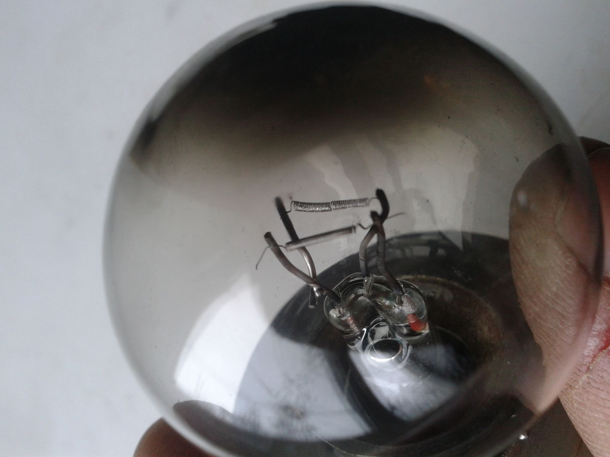 если напряжение велико и сгорает (а не перегорает) нить колба становится зеркальной если разгерметизация колбы -колба мутнеет. |