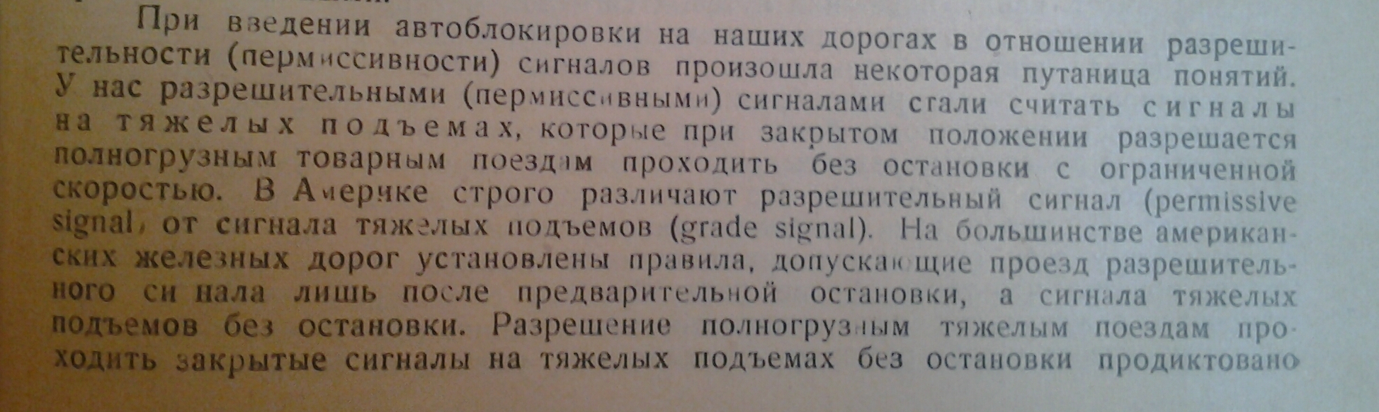 "§7. Пермиссивный сигнал На проходном светофоре, расположенном на затяжном подъеме, устанавливается дополнительная головка с синим огнем (рис.7) или допускается установка отражательного знака в виде буквы Т. Этот синий огонь или знак разрешает тяжеловесным товарным поездам проходить светофор с красным огнем со скоростью не свыше 15 км в час с готовностью остановиться в любой момент, если встретится препятствие для дальнейшего движения." |