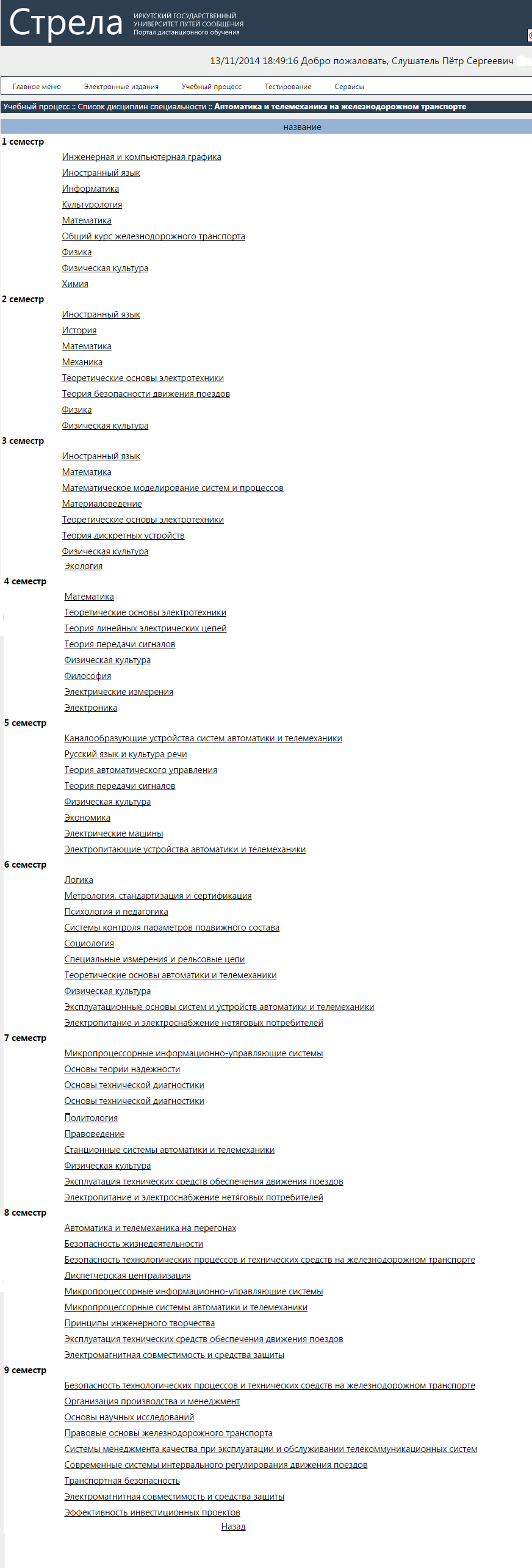 AStriker добавил 12.11.2014 в 17:13 В СОД2 добавили : -Системы контроля параметров подвижного состава. -Специальные измерения и рельсовые цепи. -Микропроцессорные системы автоматики и телемеханики. -Электромагнитная совместимость и средства защиты. -Эксплуатация технических средств обеспечения движения поездов. -Транспортная безопасность. -Эффективность инвестиционных проектов. -Организация производства и менеджмент. -Системы менеджмента качества при эксплуатации и обслуживании телекоммуникационных систем. Вроде все. AStriker добавил 12.11.2014 в 17:15 Если так интересно, то могу скинуть учебный процесс. |