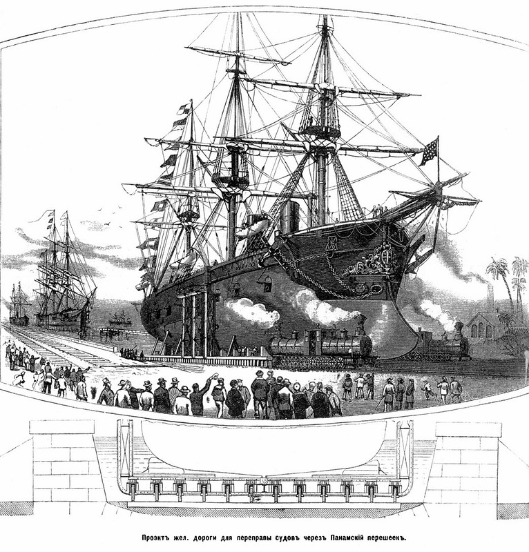 Корабельная железная дорога через Панамский перешеек. ![]() По проекту некого Кадса корабли, идущие из Тихого или Атлантического океанов, заходят в каналообразную гавань, на дне которого расположена огромная платформа на 12-ти рельсах. Корабль вытаскивается на сушу с помощью паровых машин. Далее к нему прицепляются два мощных двойных локомотива Ферли. Каждый имеет по 30 колёс. И со скоростью 18 вёрст в час корабль движется к противоположному побережью. По пути предусмотрены разъезды для встречных составов. Платформы повышенной прочности, на которых стоят корабли, имеют 1200 колёс с двойными обхватами для рельсов. Предполагалось, что строительство подобной железной дороги обойдётся в 2,5 раза дешевле и устроена она будет в три раза быстрее, чем прорытие канала. ![]() Двойной локомотив Ферли 1887 года "James Spooner". Это стандартный, а для корабельной железной дороги его предполагалось модернизировать. http://a-dedushkin.livejournal.com/1015999.html |