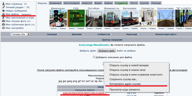 "Мои файлы" → Щелчок правой кнопкой мыши по требуемому файлу → "Копировать адрес ссылки", в буфер попадает ссылка на файл. ![]() |