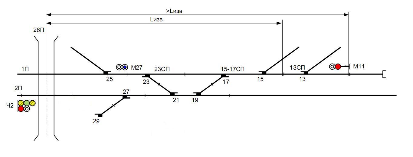 если маршрут задаётся по 1П через М27 (он ограждает переезд), то нет; если маршрут задаётся по 2П по минусу стрелок 17/19, то да. если маршрут задаётся по минусу стрелок 27/29 (не видно продолжения), то ???. |
