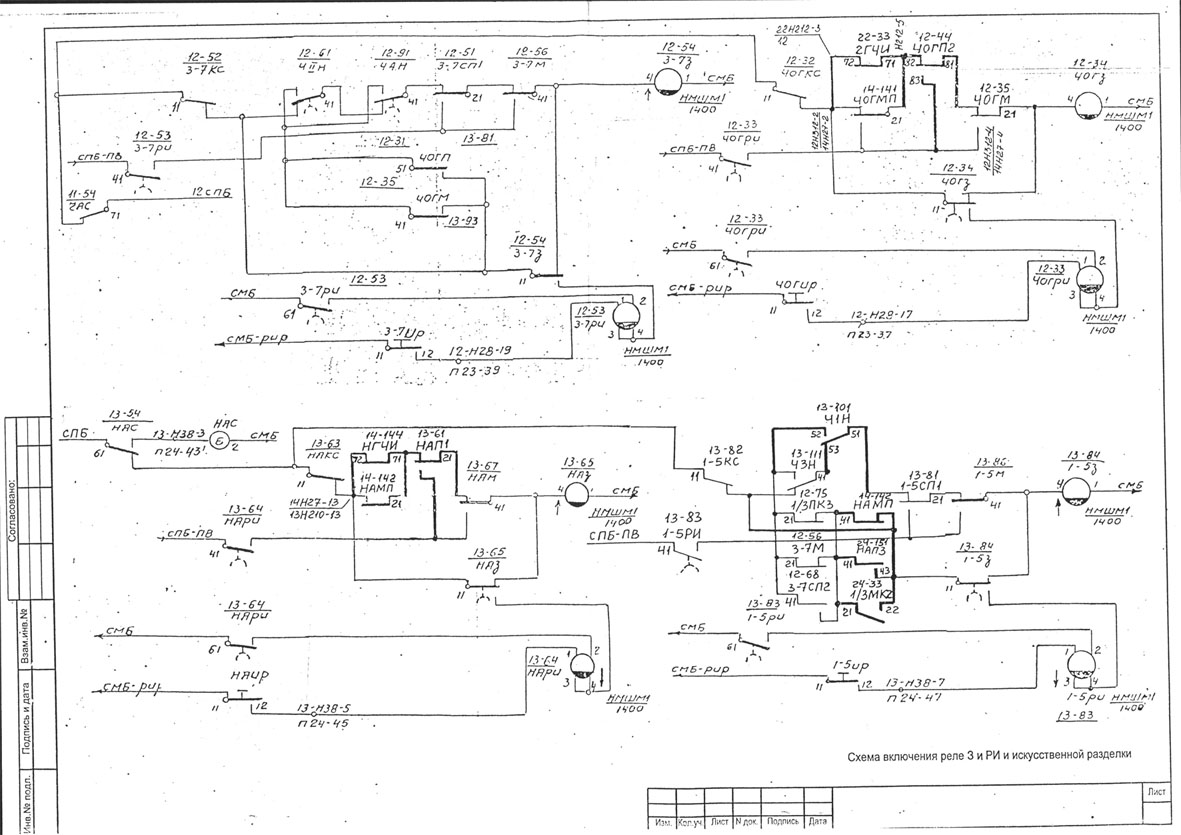 На УРЦ не похоже. Скорее потомок ТР-43. Вводит в ступор обозначение реле М (на втором листе слева внизу), обозначение до 60 годов и в то же время НМШ1-1800? Шины питания РИР, ПВ, МВ вроде из недавних ЭЦ, но странное обозначение блоков и их нумерация (М1, 13-7).....Надо полистать манускрипты, может что и попадётся. Может быть проект какого нибудь Министерства угольной промышленности или МВД? |