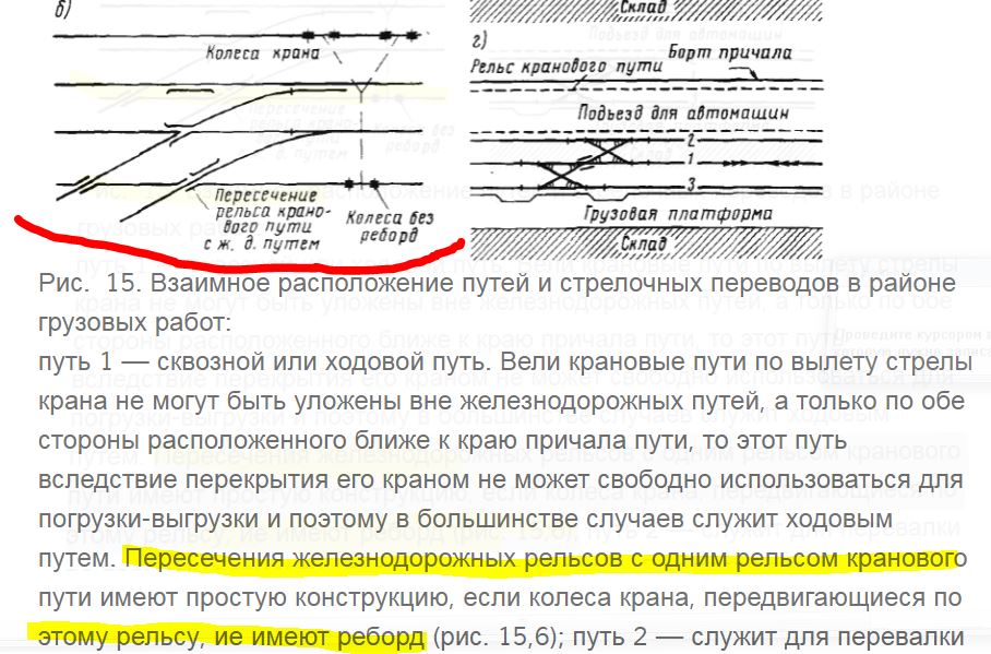 Добрый день! Работаю в порту г. Санкт-Петербурга и требуется организовать глухое пересечение ж/д пути с подкрановым рельсом. В документации и учебниках такое пересечение встречал только в виде схемного чертежа и при условии, что колесо портального крана без реборд (см картинку)