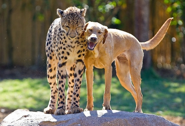 Грозный с виду хищник, гепард пуглив по своей природе, большинство гепардов ведет одинокий образ жизни и не подпускает к себе никого, что сильно осложняет процесс размножения в неволе. Как ни странно, присутствие собак гепарды терпят гораздо легче, чем присутствие другой особи своего вида. Более того, это позволяет усмирить инстинкты гепардов и сделать их более терпимыми к гепардам и людям. У некоторых гепардов из зоопарка Сан—Диего есть компаньон — собака. Их берут в основном из приютов, и сводят трехмесячных щенят с гепардами того же возраста. Собака занимает доминирующую позицию в паре и служит моделью для поведения, а также защищает своего подопечного. С самого детства животные проводят почти все время вместе. http://www.adme.ru/vdohnovenie-91970...esyaca-607205/ |