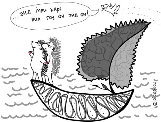 ежик Клаус очень любил ежика-девочку по имени Пуговка, и собирался сделать ей предложение. другие ежики советовали ему не заморачиваться, а просто пригласить Пуговку в "шоколадницу", а потом подарить браслетик "пандора" или айфон пять эс как доллар - и дело в шляпе. но Клаус помнил, что Пуговка всегда мечтала прокатиться на корабле "как в титанике", поэтому он смастерил из подручных материалов (которых в лесу до черта) парусник и исполнил мечту Пуговки. друг ежика Клауса, воробей Ипполит, летел в это время над влюбленными и пел песню Селин Дион. и Пуговка сказала "да" http://morepic.ru/images3/2_2018.jpg Nastya Vinokurova |