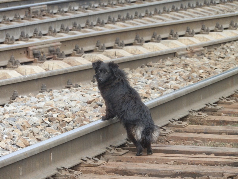Бродячая собака наступила передними лапами на рельсы и пару минут вдумчиво смотрела в сторону.