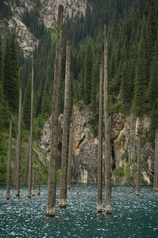 Озеро Каинды похоже на захоронение древних суден — как мачты затонувших кораблей из бирюзовой глади озера торчат острые пики. В 1911 году в этой местности произошло землетрясение, оползень, возникший в результате катаклизма, перекрыл реку, и долина перед этим препятствием наполнилась водой. Так и образовалось загадочное озеро Каинды в высокогорье Казахстана.