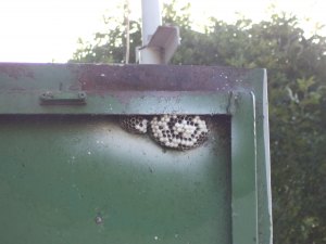 Отчитываюсь. Это были неправильные осы, они спали не ночью, а утром. Раньше, когда я шевелила дверь, сверху в щель вылетало 1-2 осы, кружили и залетали обратно. А сегодня в 7.30, когда под чутким руководством водителя из РЦС, мы открыли дверь, никто не вылетел и не прореагировал на нас. Короче, гнездо оказалось прямо на дверях. Тоже какое-то неправильное или скорее недоделанное. Гнездо обпрыскали из аэрозоля, осы попадали в обморок на асфальт и т.д. Фото гнезда прилагается