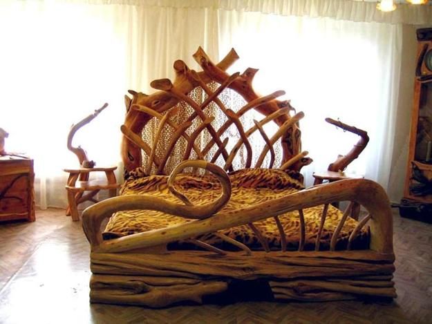 Для любителей природных элементов в интерьере: колоритная деревянная кровать из обработанных толстых веток деревьев..