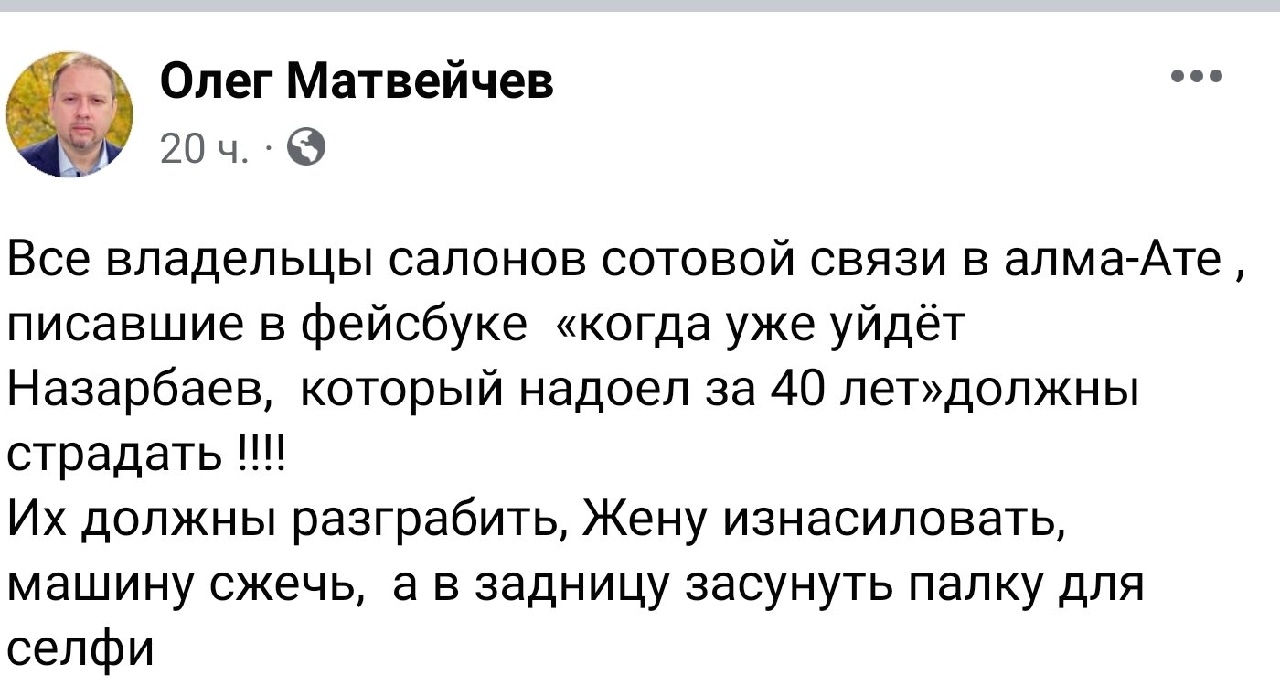 Мимо_проходил добавил 07.01.2022 в 17:57 Депутат Госдумы от «Единой России» Олег Матвейчев предложил изнасиловать недовольных режимом Назарбаева казахстанских предпринимателей и их жен. Матвейчев – профессор Финансового университета, бывший замглавы Волгоградской области, победитель конкурса «Лидеры Рашки. Политика». ![]() Из комментариев: Цитата: