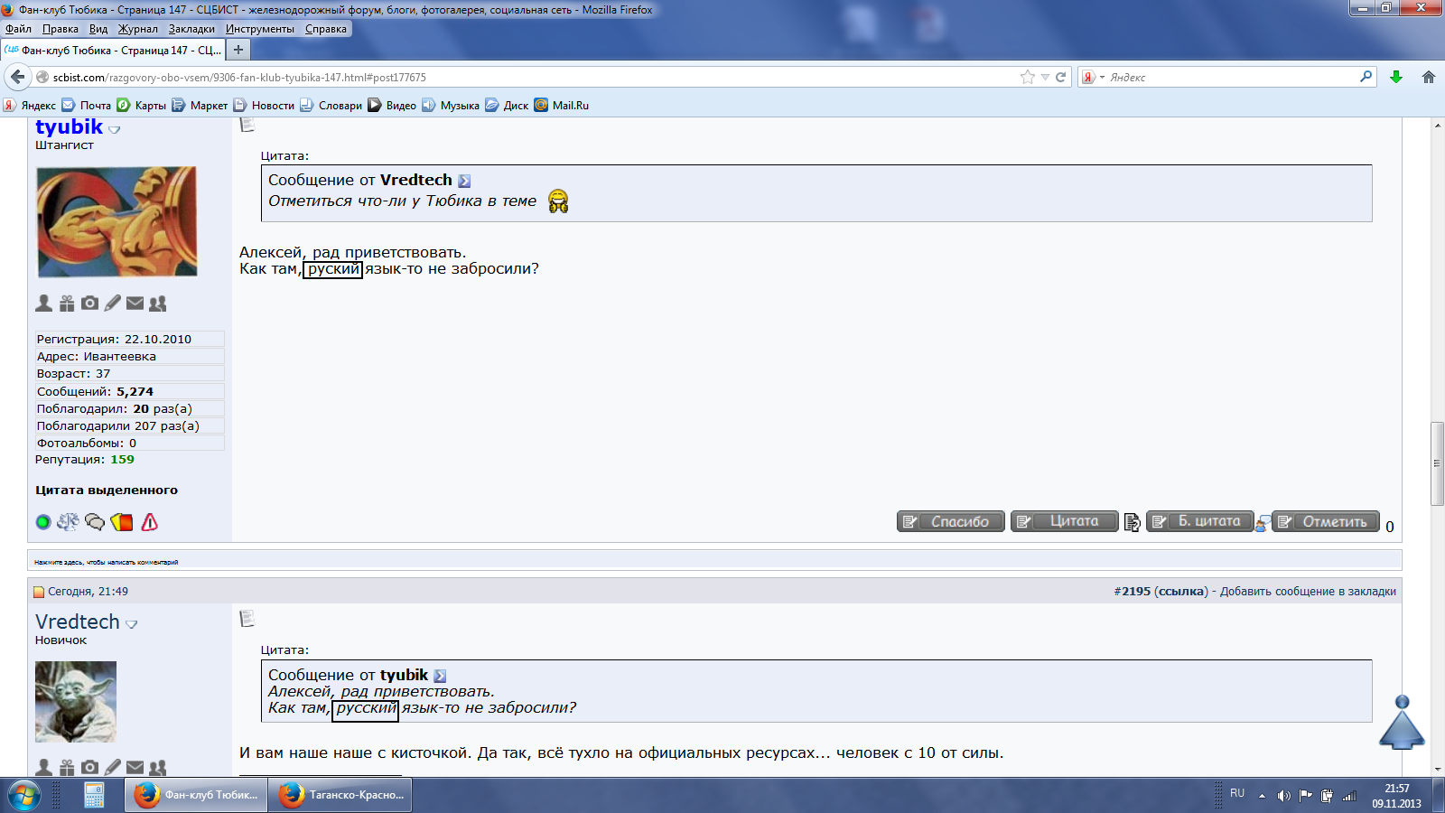 Форум сайта ЦТ. Брянск Свердловск Свердловск-больничка Нижегородец Law WWW Красноярск (РЦС-2) Красноярск (психологи) РЖД (форумы и чуть блогов) ПКБ ЦТ Ещё какой-то был (от ВНИИЖТа?), лет 5 назад прикрыли. В принципе, я оттуда и не уходил, но сейчас на работе даже полчаса свободного нет - хоть новости краем глаза посмотреть. Так что появляюсь крайне редко.