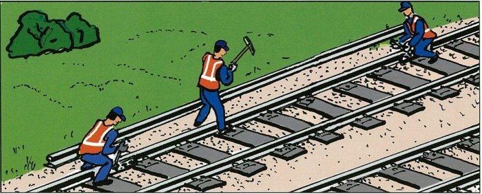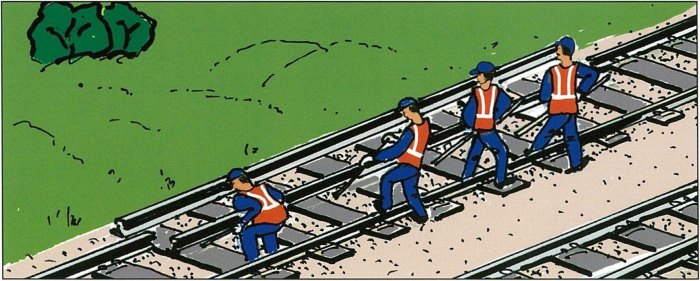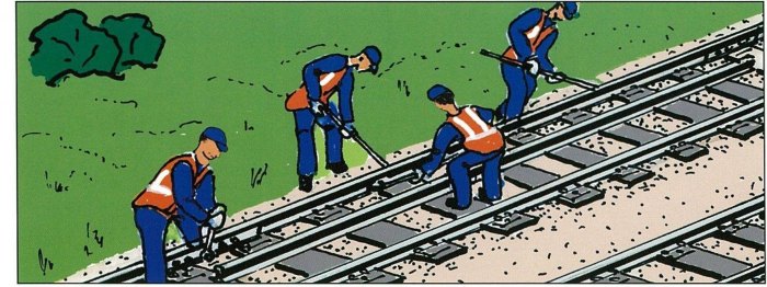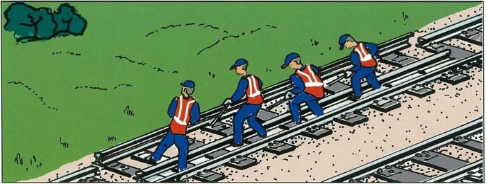 Тема: =Самоучитель путейца= Одиночная смена рельса при костыльном крепленииОдиночная смена рельса при костыльном креплении ![]() 1. Наддергивание наружных и выдергивание внутренних основных костылей. Снятие стыковых болтов и накладок. ![]() 2. Сдвижка и уборка с пути сменяемого рельса. ![]() 3. Надвижка нового рельса ![]() 4. Установка накладок и оболчивание стыков. Пришивка рельсов с забивкой по одному костылю внутри колеи и добивкой наддернутых наружных костылей. ![]() а — на участке с электротягой и автоблокировкой; б — на участке с электротягой без автоблокировки; 1 — сменяемый рельс; 2 — поперечные перемычки; 3 — изолирующие стыки (стрелками показано направление обратного тягового тока); 4 — продольный обходной провод Место работ ограждают сигналами остановки. Машинистам выдают предупреждение об остановке у красного сигнала, а при его отсутствии — о следовании с установленной скоростью. |
