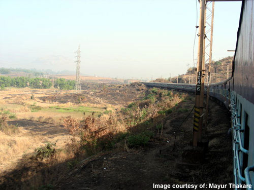 A train from Pune to Mumbai, off Lonavala. Indian Railways has enough land beside its tracks to grow sufficient plants to enable all its trains to run on 10% biodiesel blend.