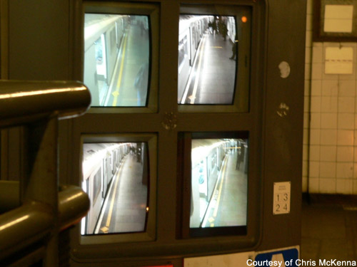 CCTV monitors watching the platform at London Underground's Tower Hill station.