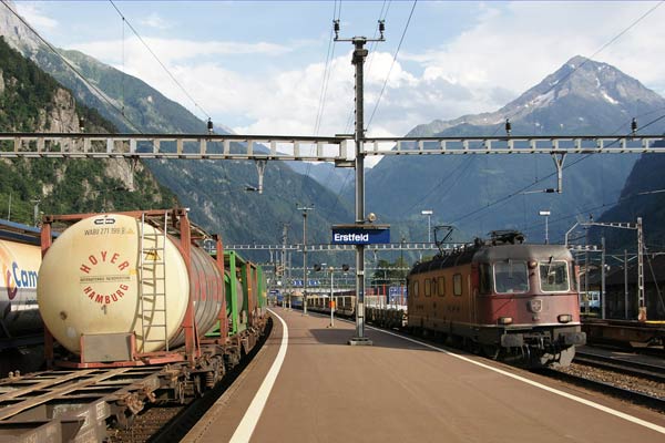 Awaiting paths over the Gotthard – freights at Erstfeld, Switzerland.