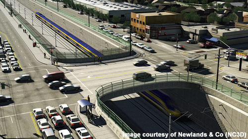 A computer-generated image depicting how California's High Speed Rail could fit with other traffic and existing infrastructure in Burbank, CA. The US is poised to create high-speed rail corridors across the nation – calling for a variety of engineering skills.