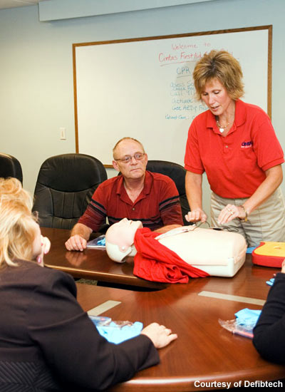 Sue Kastenson conducts a training session using the Defibtech AED for cardiac arrest with the Trans International response team.
