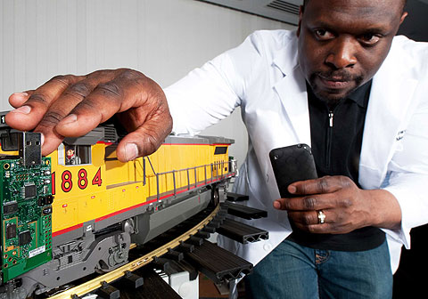 At IBM's Industry Solution Lab in Hawthorne, NY, research scientist Johnathan Reason collects data from wireless sensors on a model train.