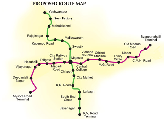 The first phase of the Bangalore metro is for two intersecting routes totalling 33km.