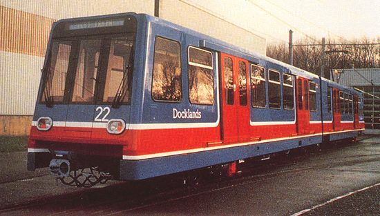 The forerunner of Thessaloniki's new automatic trains, a London Docklands Light Railway unit.