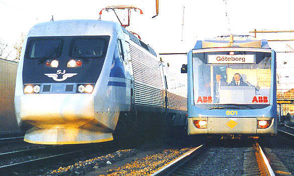An X2000 train alongside a light rail Variotram at Gothenburg.