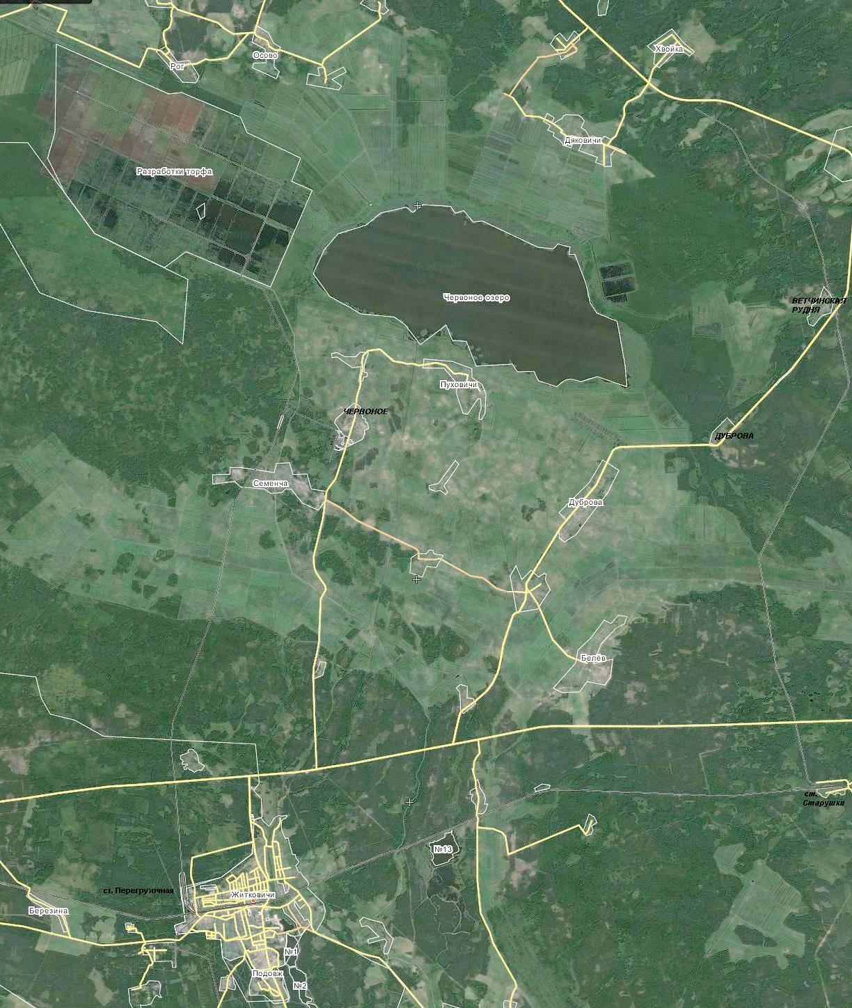 Узкоколейная железная дорога на спутниковых снимках (источник — «Wikimapia.org»).