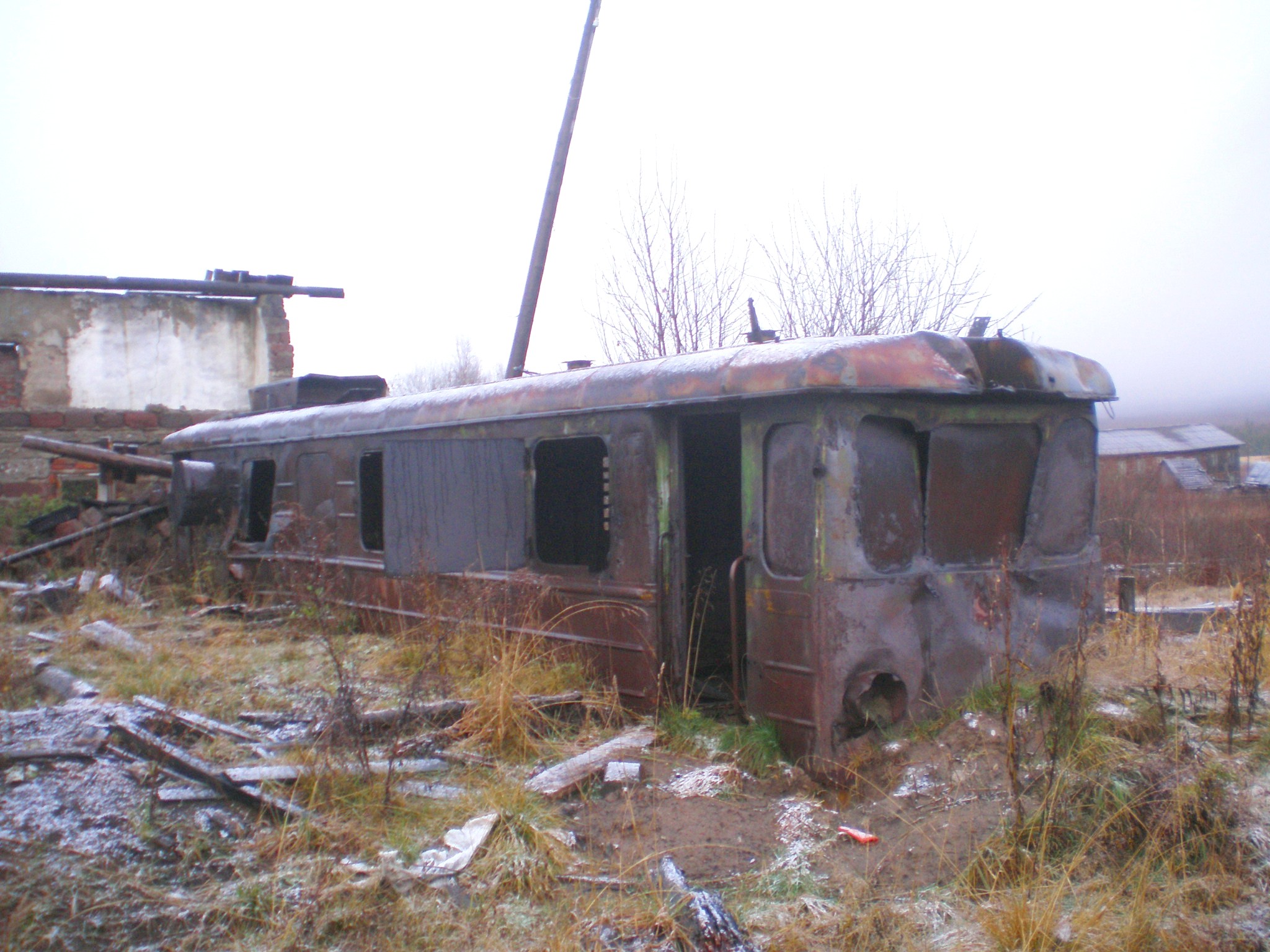 Разрушенная станция Талая, главная станция Луньевской узкоколейной железной дороги (посёлок Талый). Автомотриса АМ1.