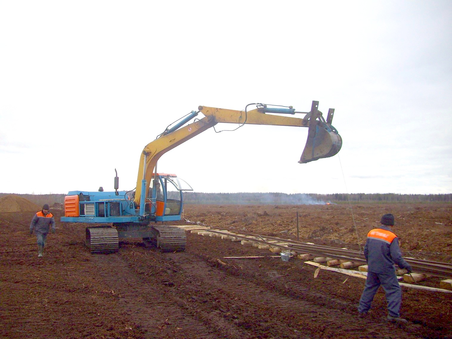 Страница является незавершённой. На снимках: полевая база, укладка временного пути, погрузка торфа.