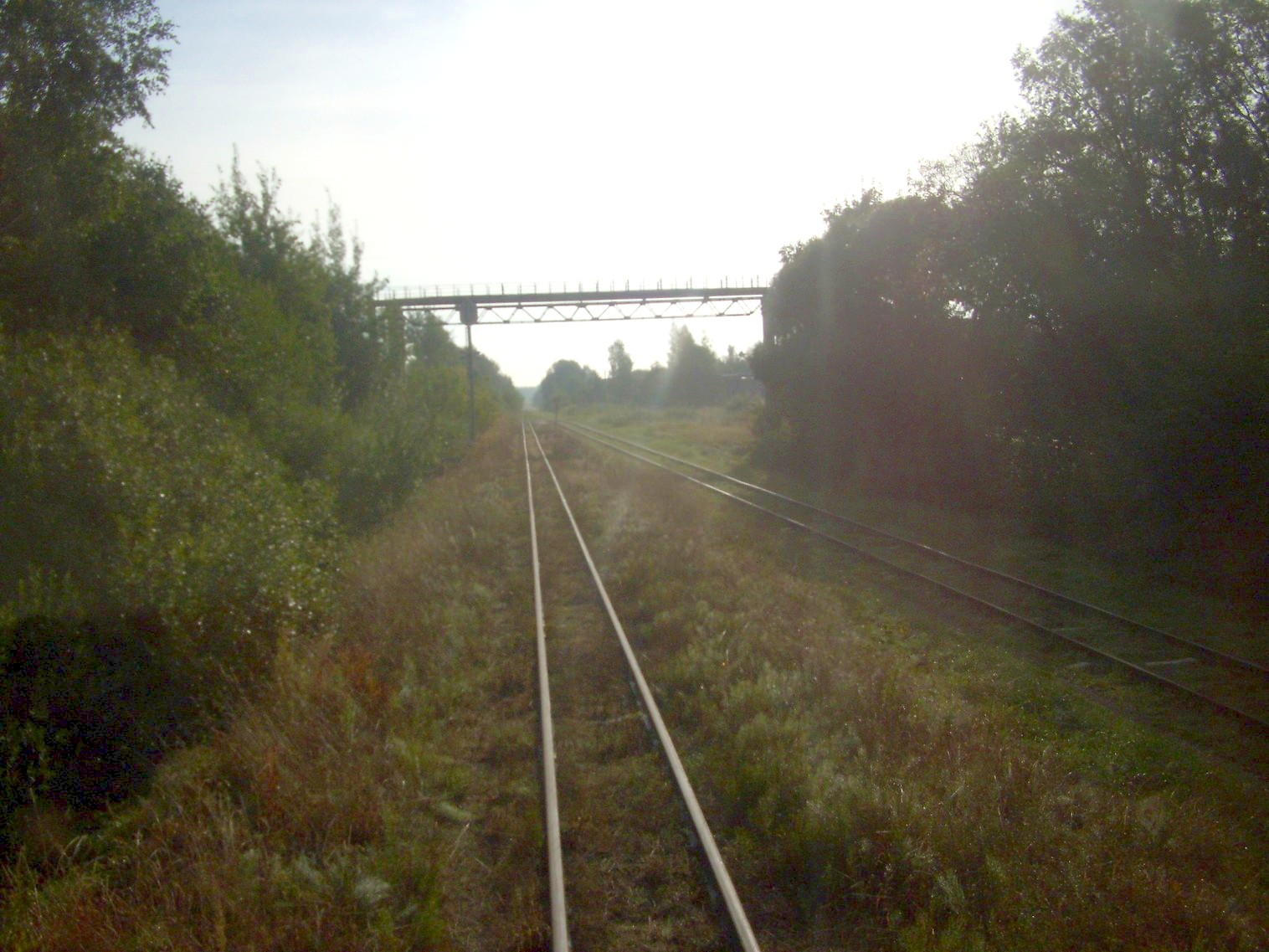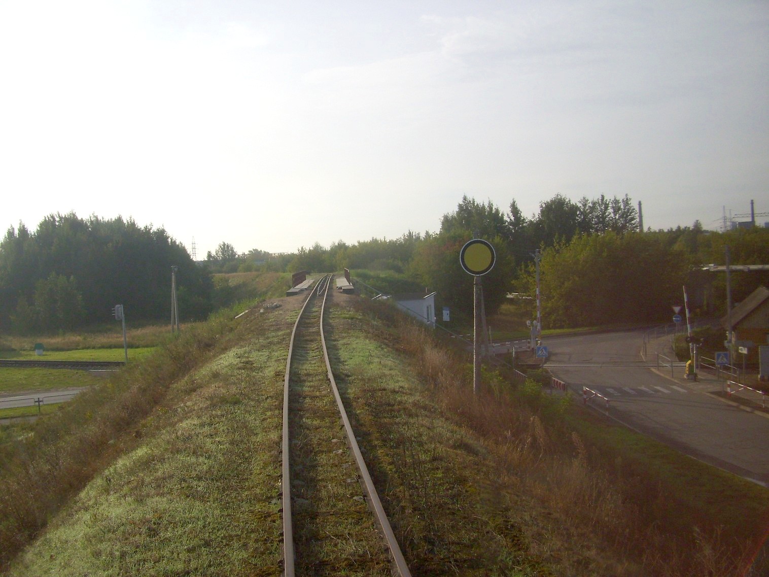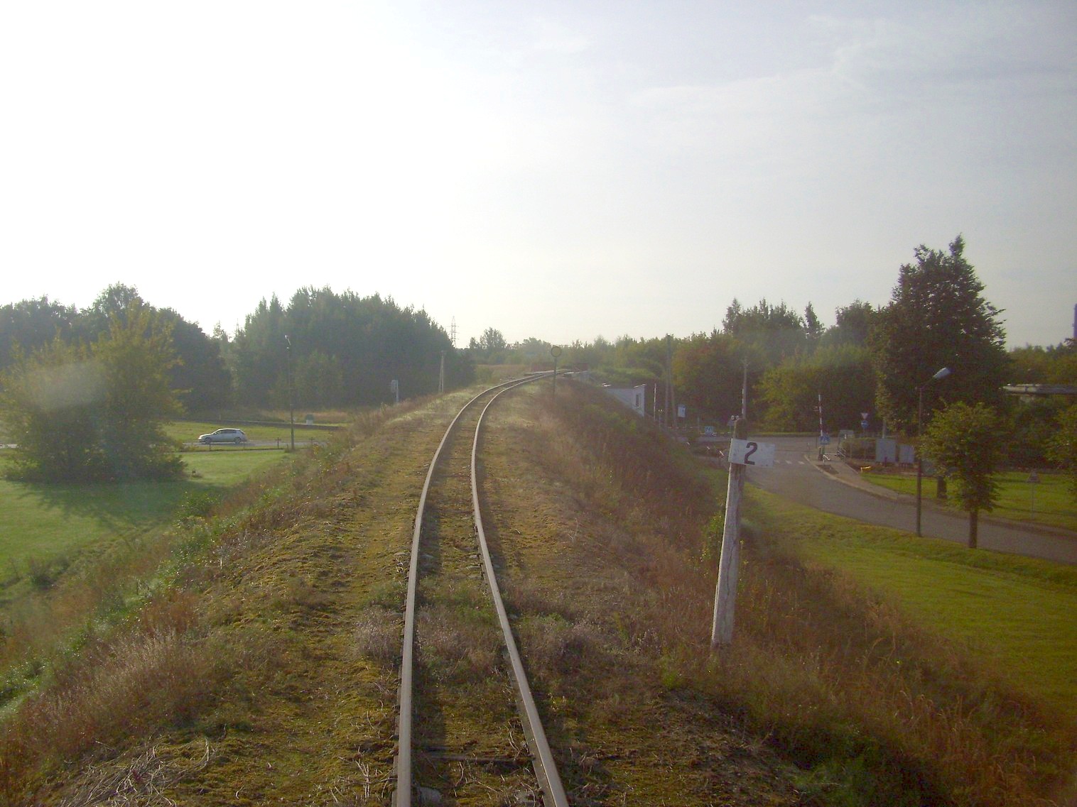 перегон Паневежис — Рагувеле в черте города Паневежиса, путепровод над магистральной железной дорогой, движение рядом с подъездным путём широкой колеи, платформа Тарушкос.