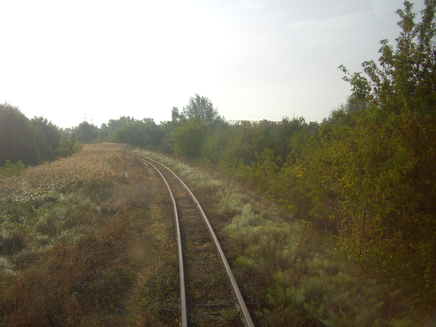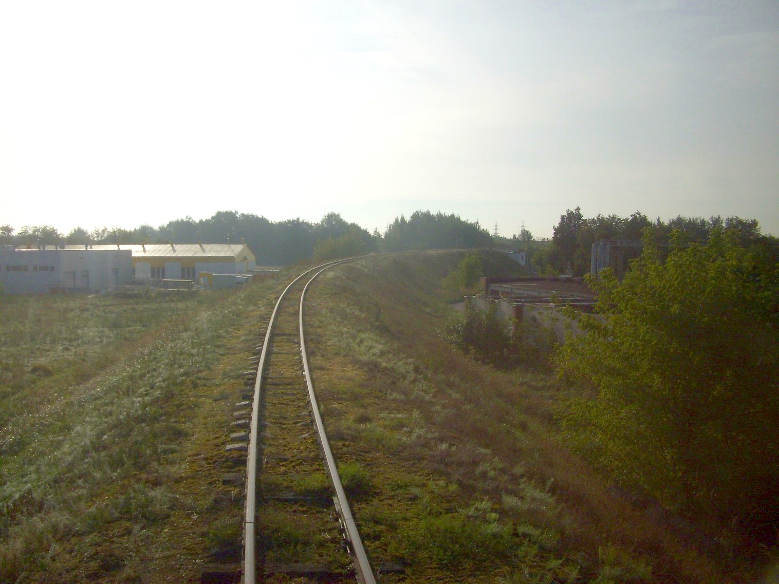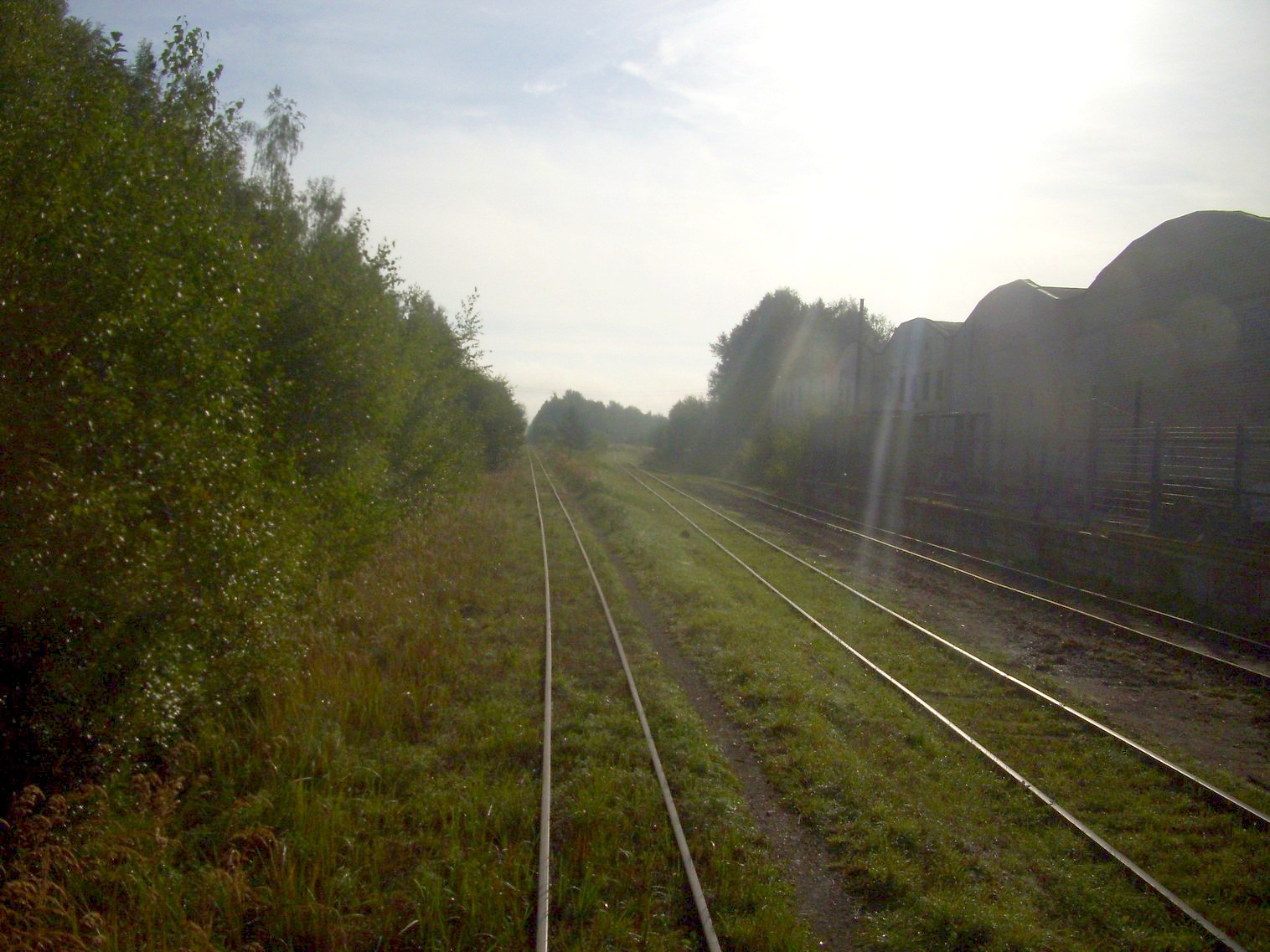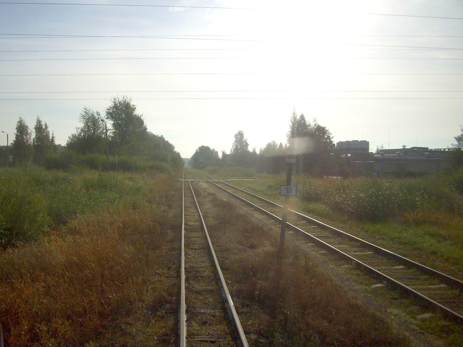перегон Паневежис — Рагувеле в черте города Паневежиса, путепровод над магистральной железной дорогой, движение рядом с подъездным путём широкой колеи, платформа Тарушкос.