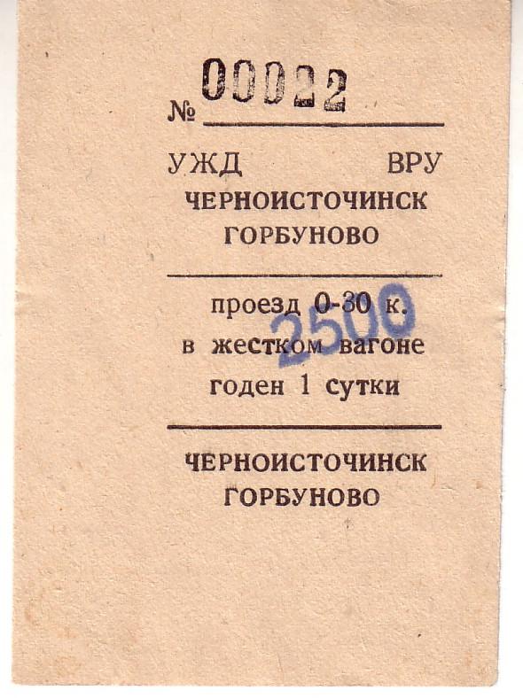 Билет для проезда по маршруту Черноисточинск — Горбуново.
