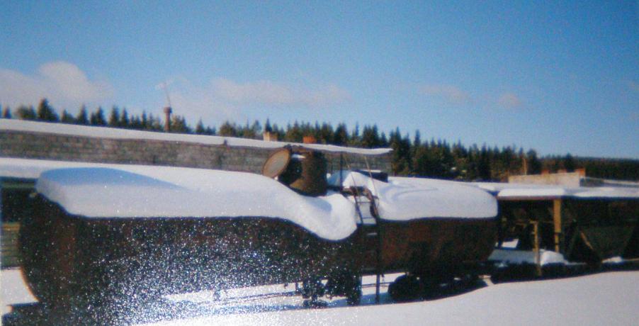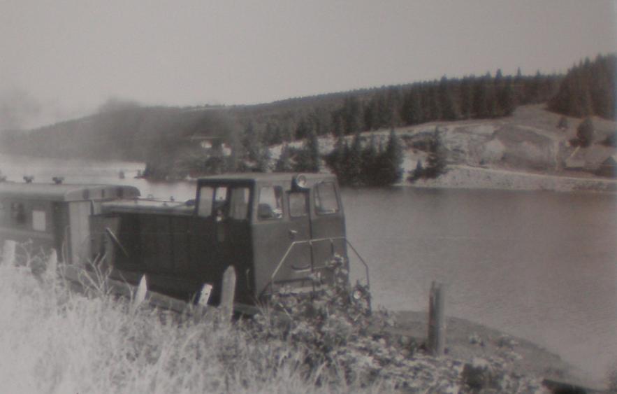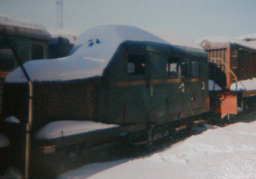 на колею 750 мм в 1960 году), используемый в качестве бытовки. На момент съёмки стоял на осях