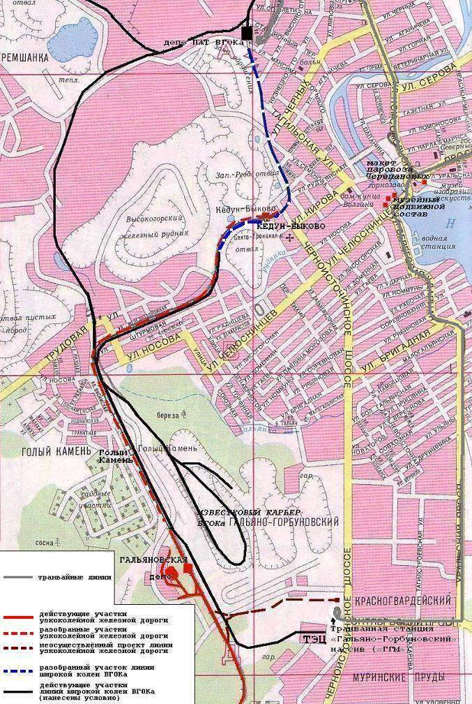 Схема линии узкоколейной железной дороги (по состоянию на май 1998 года).