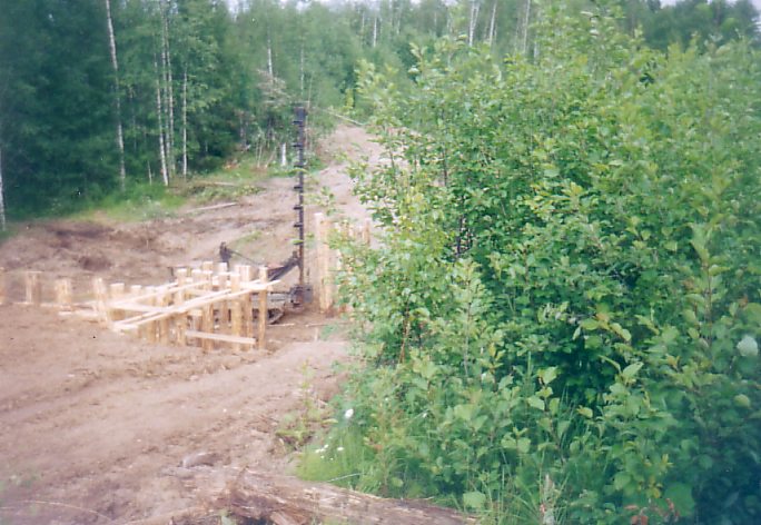 Затем я направляюсь к самому дальнему на сегодняшний день месту, до которого можно доехать по узкоколейной железной дороге. Это строящийся мост через реку Мялсома, расположенный на 44-м километре. Мост возводится взамен старого, пришедшего в негодность. Деревянные сваи забиваются агрегатом на гусеничном ходу, работает бульдозер. По планам леспромхоза, заготовка леса начнется дальше, за Мялсомой. В ближайшие годы Лепшинская узкоколейная железная дорога получит некоторое развитие.